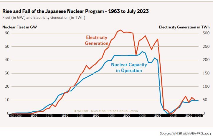 Am 01.01.2024 wurde Japan von einem Erdbeben der Stufe 7,6 erschüttert. Zum ersten Mal seit dem Jahr der Fukushimakatastrophe 2011 wurde eine starke Tsunamiwarnung ausgesprochen. Zum Glück konnte teilweise bereits wieder Entwarnung gegeben werden. Da Japan sich in einem sehr aktiven Erdbebengebiet befindet, stellen Tsunamis eine der größten Sicherheitsrisiken für Atomkraftwerke dar. Nach der Fukushimakatastrophe hat Japan reagiert und fast alle Reaktoren vom Netz genommen (siehe Abbildung). In den vergangenen Jahren kam es jedoch zu einem drastischen Kurswechsel in Japans Politik und es ist geplant, einige der alten Reaktoren wieder in Betrieb zu nehmen.