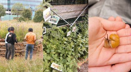 Außerdem wurden auch Bilder von Raupen an ihren jeweiligen Futterpflanzen vor Ort angebracht, was den Kindern verdeutlicht, dass manche Raupen nur von einer Pflanzenart leben können und es erst bei hoher Pflanzenartenvielfalt eine hohe Artenvielfalt unter den Schmetterlingen sowie anderen Insekten geben kann. Von den Umweltspürnasen mitgebracht wurden auch Schnecken, welche die Kinder ebenso auf die Hand nehmen durften. Auch ein Bewegungsspiel mit Quizfragen (1, 2 oder 3) stand auf dem Programm.