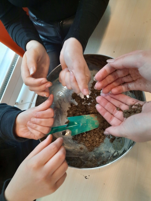 Außerdem konnten die Teilnehmer*innen in Kleingruppen selbst aktiv werden und erleben, wie aus Erde und bienenfreundlichen Samen sogenannte „Samenkugeln“ hergestellt werden. Im Frühjahr können die „Samenkugeln“ in Gefäßen auf z. B. Fensterbrettern, Balkonen und Terrassen angebaut werden und so für reichlich Insektenfutter für unsere summenden Freunde sorgen.