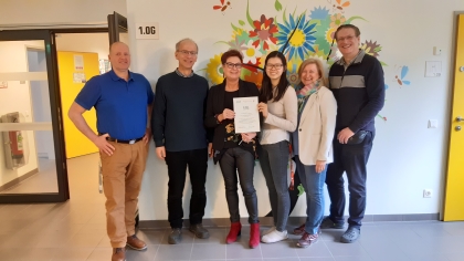 Bildtext: Frau Direktorin Karin Manhart (3.v.l.) mit Ihrem Umweltteam bei der Überreichung des PUMA-Schulen Gütesiegels durch Frau Fachinspektorin Canaris und PUMA-Programmleiter Herrn Mag. Schreiber